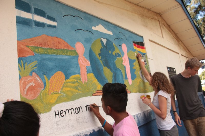 Angefangen bei unserer Partnerschule „Luiz Alberto Garcia“ in Fatima, San Marcos. Mit viel Herzlichkeit und Aufwand sind wir von den Schülern und Lehrern empfangen worden. Es wurden die Hymnen beider Länder gespielt und nationaltypische Tänze aufgeführt. In den nächsten Tagen herrschte ausgelassene Stimmung beim Lernen der Sprachen, beim Malen eines Partnerschaft-Wandbildes, das in einer ausgelassenen Farbschlacht endete. Wir kochten zusammen, besuchten die Stadt Granada und badeten gemeinsam im Pazifik. Insgesamt herrschte immer eine offene Stimmung, die weder Worte noch Sprache bedurfte. Als finaler Schritt wurde unsere Partnerschaft mit der gegenseitigen Unterschrift besiegelt.